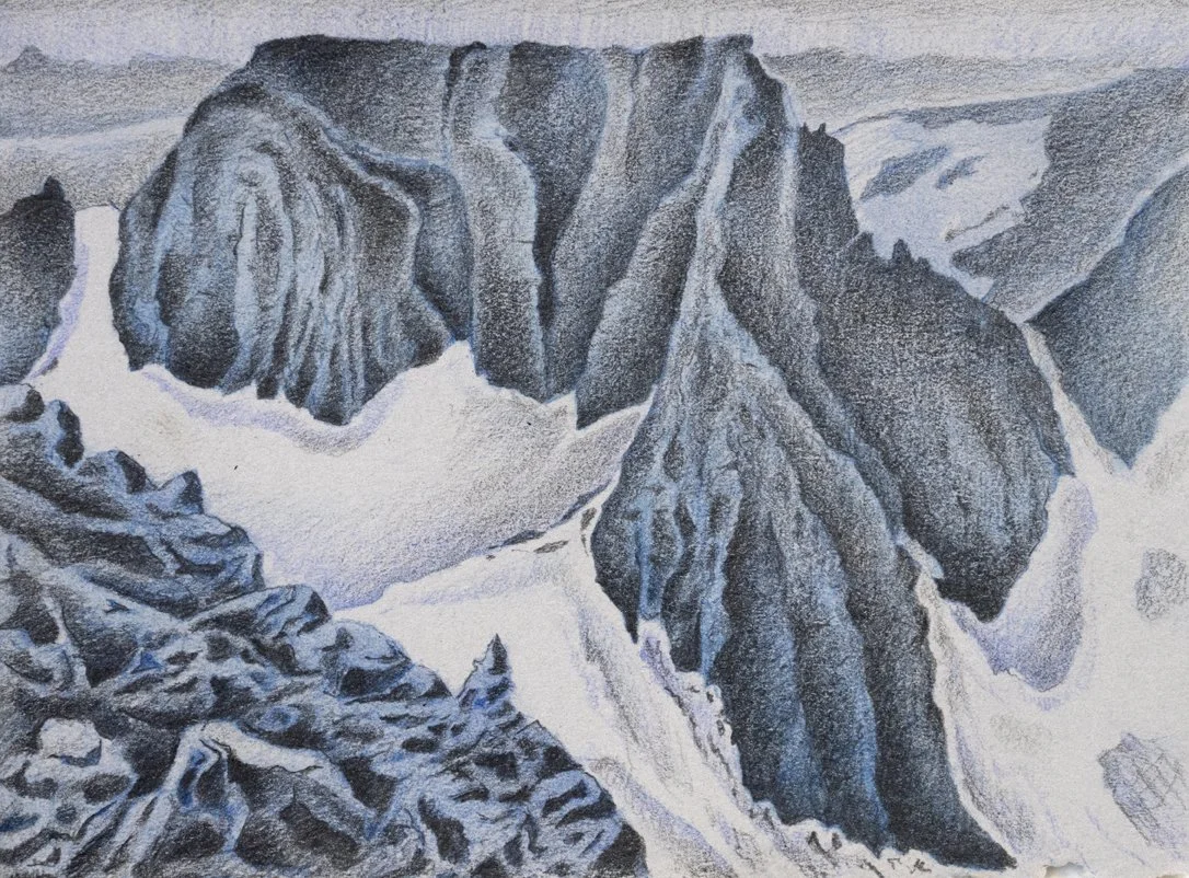 Jonathan Marquis is a multi-media artist and mountaineer seeking immersive experiences with wildland terrain to inspire the protection of more-than-human geographies. Marquis created the Glacier Drawing Project in 2014 to bear witness and draw every named glacial feature in Montana before a warming climate melts the ice beyond recognition. The drawings explore a personal connection with glaciers through color, mark-making, and careful attentiveness. Each year, he visits new glaciers, revisits others, and often draws from remote mountain summits that grant glimpses into some of Earth's most intact wilderness geographies. With only seven more glaciers left to visit, the Glacier Drawing Project will be the only on-site, hand-drawn visual record of every named glacier in the Crown of the Continent and Greater Yellowstone ecosystems of Montana.